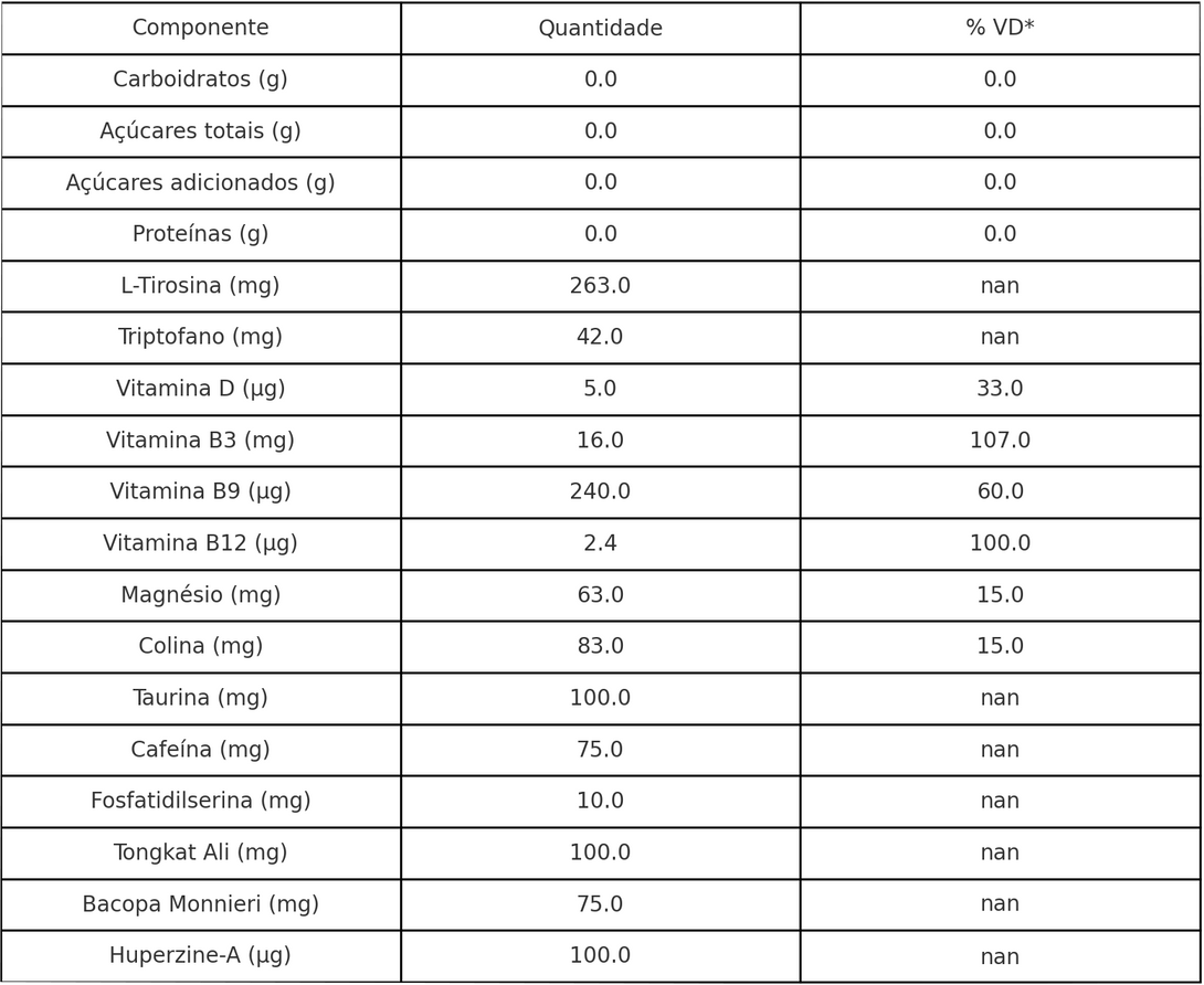 A Bacopa Monnieri potencializa a cognição e atua como um calmante natural, diminuindo a ansiedade. Já a Huperzina-A preserva a acetilcolina, crucial para o desempenho cognitivo. Juntos, esses compostos trabalham para elevar seu estado mental, físico e emocional, potencializando seu desempenho diário.